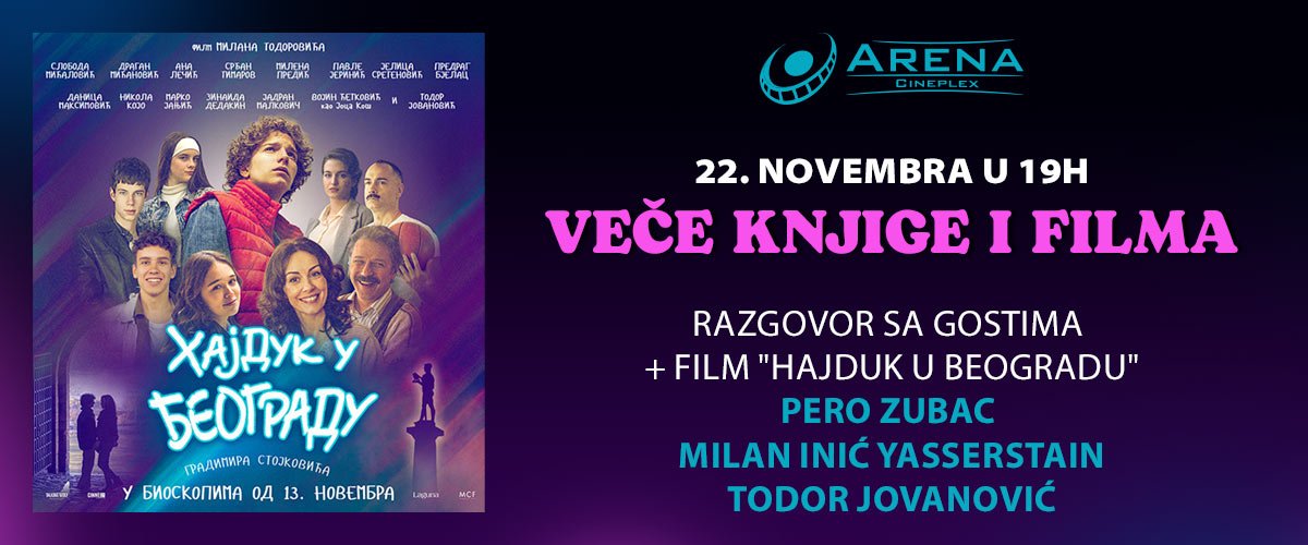 Omiljeni gradski bioskop, Arena Cineplex, organizuje druženje namenjeno svim generacijama i ljubiteljima knjige, filma i ekranizovane književnosti, sa specijalnim gostima u subotu, 22. novembra od 19 časova. Nakon razgovora sa gostima u bioskopskoj sali, uslediće projekcija novog domaćeg filma “Hajduk u Beogradu”, rađenog po romanu Gradimira Stojkovića, a ulaznice za kompletan događaj su u prodaji na blagajni bioskopa.